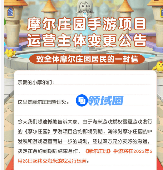今日,《摩尔庄园》手游官方宣布,由于淘米游戏授权雷霆游戏发行的《摩尔庄园》手游项目合约即将到期,淘米游戏对摩尔庄园IP发展与游戏运营有进一步规划,游戏将在2023年5月26日起移交淘米游戏发行运营,雷霆不再续约。