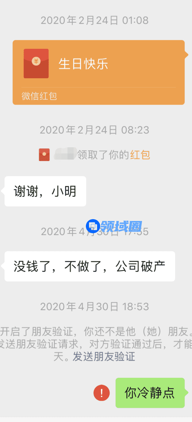 上面孙某说的自己钱被骗完的第二天晓明打算和孙某再问问他那边的情况,没想到一打开手机就是一个能让人虎躯一震的消息,一句“没钱了不做了”化为最锋利的冰锥刺进晓明的胸膛,更讽刺的是上面的消息还是孙某在生日时晓明给他发红包的记录。