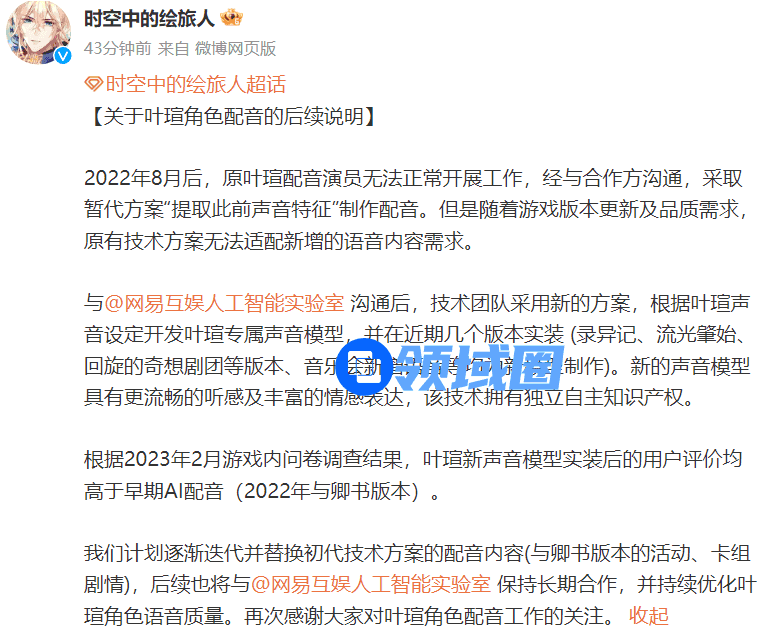 3月20日,《时空中的绘旅人》官博发文,表示2023年2月游戏内的问卷调查结果显示,叶瑄新声音模型实装后的用户评价均高于早期AI配音,未来游戏官方计划逐渐迭代并替换掉初代技术方案的配音内容。