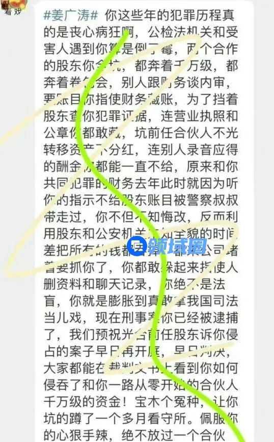 去年7月,网上出现爆料称姜广涛被警方带走,随即姜广涛旗下工作室光合积木发表声明,说是因为商业纠纷正在配合调查。在线下活动取消、配音项目停更的同时,有“知情人”出面爆料,姜被带走的真实原因是因为以职务之便骗钱,藏账目,藏公章,藏营业执照,涉及了刑事犯罪。不久后,网友查到反馈回复信息是职务侵占2000万元,再次证实了这一消息。