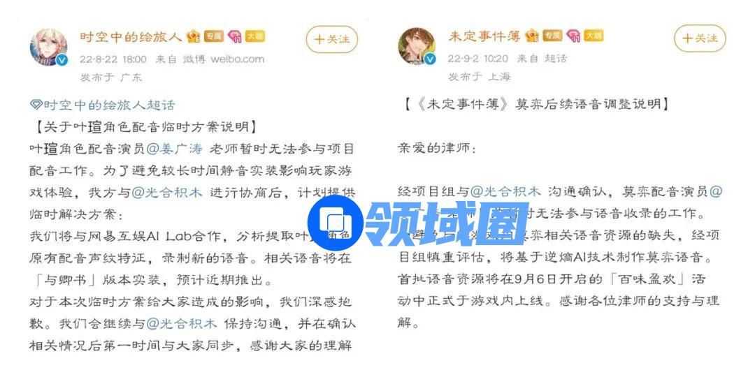 瓜还没吃完,网易的《时空中的绘旅人》和米哈游《未定事件簿》就前后脚宣布,游戏中姜广涛配音的角色,后续将更换为AI配音。
