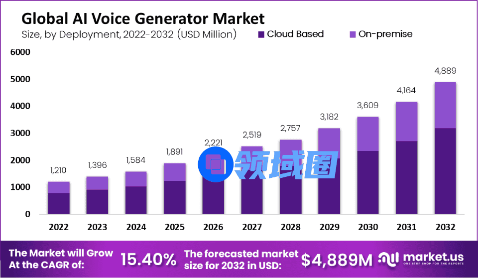 据Market.us统计,2022年全球Ai语音生成市场规模约达12.1亿美元,预计在2032年,该数据将增长至48.89亿美元,复合年增长度达15.4%。