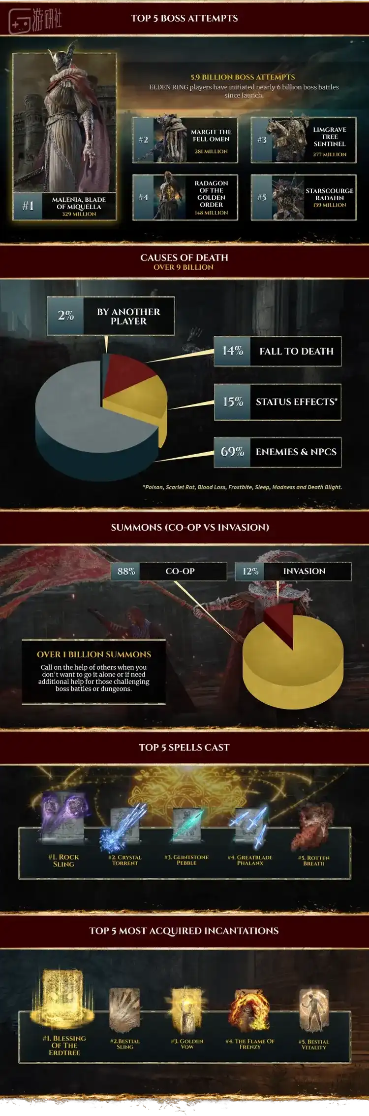 为庆祝《艾尔登法环》一周年,万代南梦宫公布了一组游戏数据。