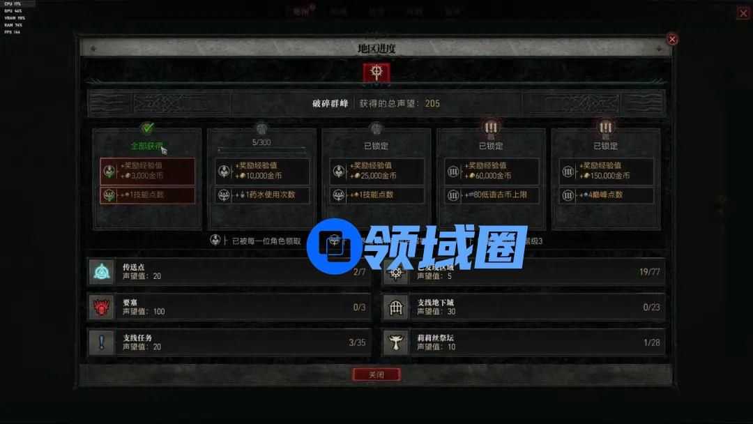 同时为了加强玩家的探索体验,《暗黑4》将探索玩法融入到了地区声望中,无论是找到传送点,发现区域还是完成支线任务探索支线地下城,玩家都能收获一定量的探索声望,并通过探索声望点数来解锁对应的奖励。就目前开测的第一张地图破碎群峰,就已经提供了35个支线任务,77块探索区域以及23个地下城。