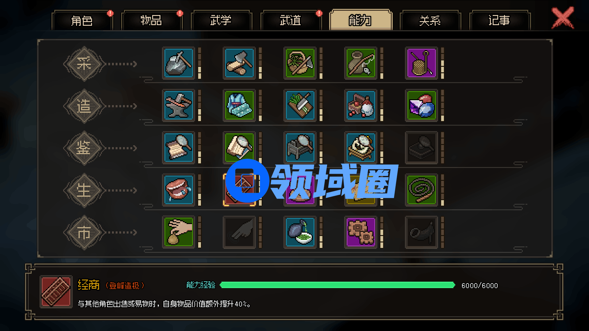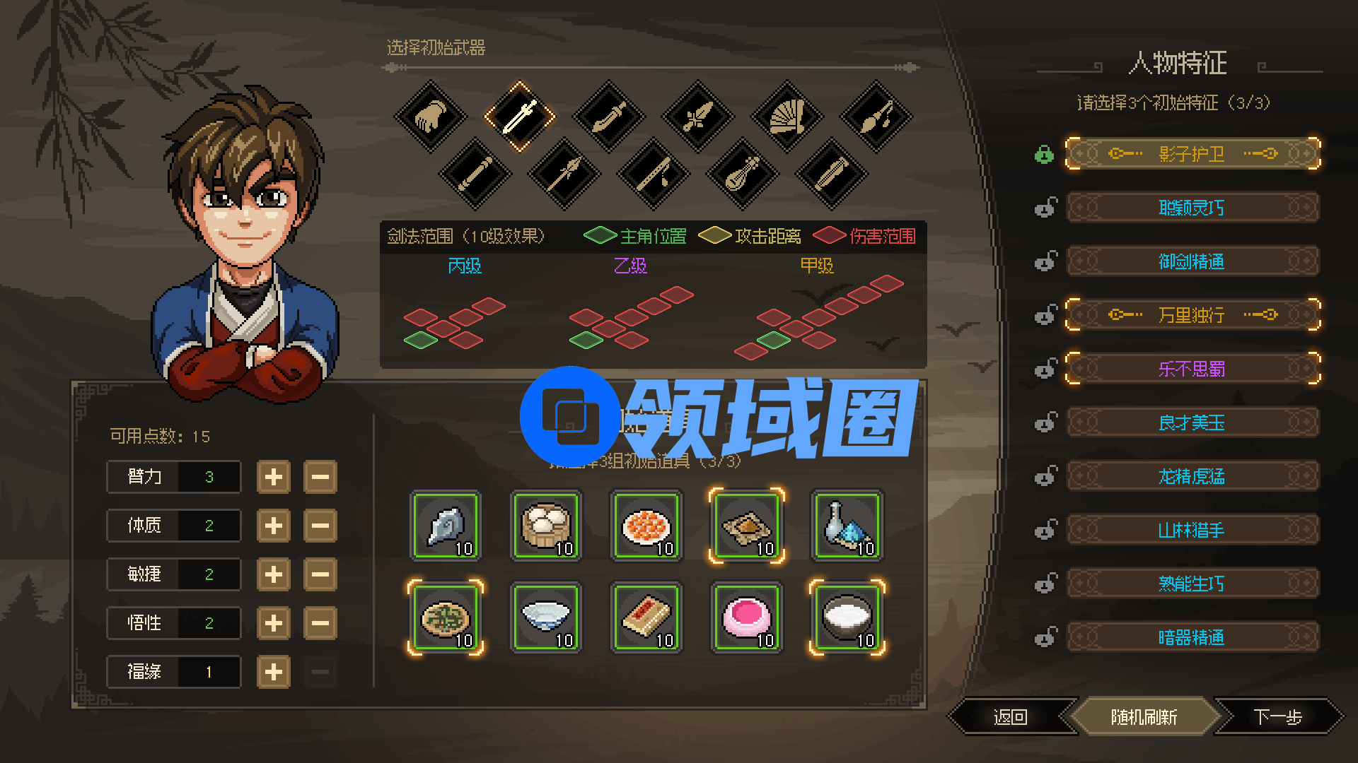 玩家初始包含15点数,需要分配到五项基础之上。然后要选择初始道具、初始特征(Buff)和武器(攻击方式)。不同的基础值会带来不同的优缺点,也会解锁一些新的特征。游戏内还包括品行、天赋、能力(锻造等技能熟练度)、武学(主被动技能)、武道(天赋树)等多种元素。