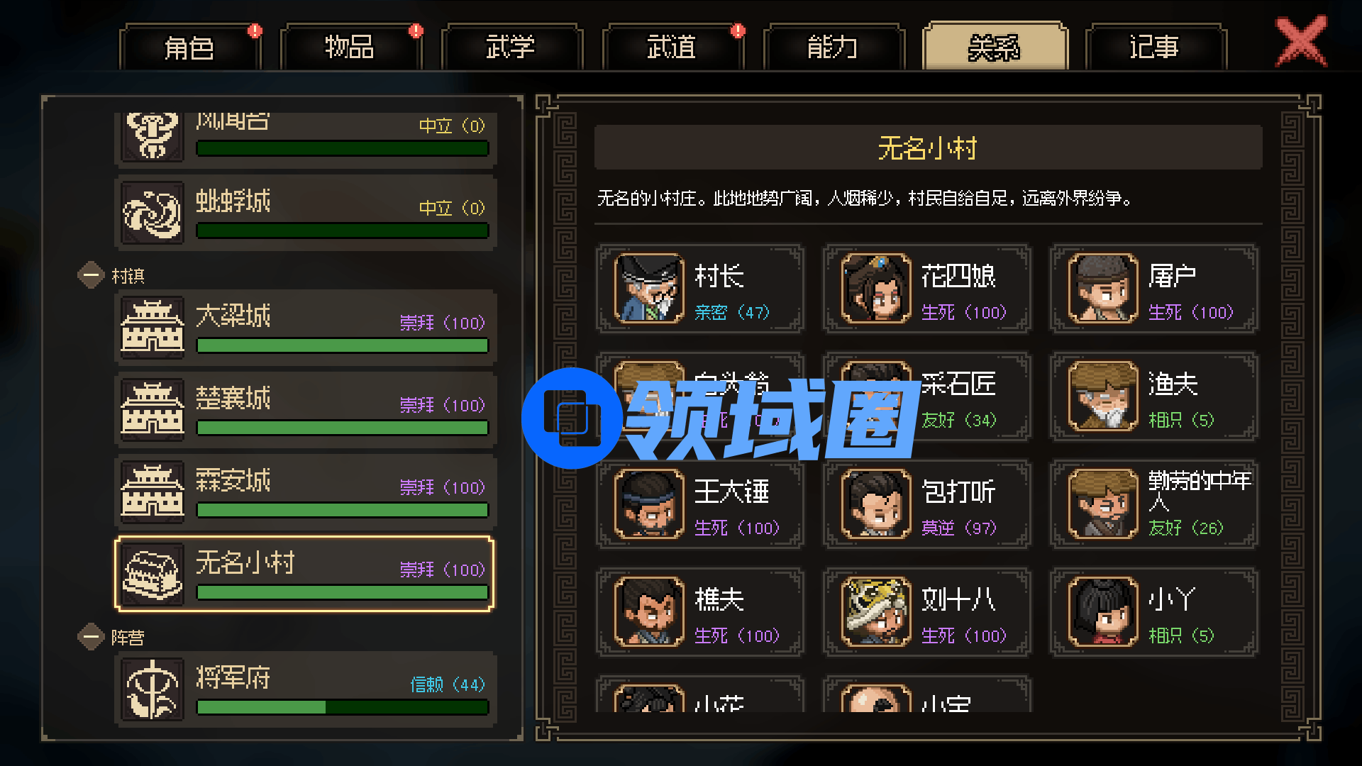 在此基础上,游戏中存在各种城市、门派、势力。玩家需要根据自己的想法与不同的人结缘,无论良孽,甚至邀请入队。这些关系也会影响隐藏剧情等要素的出现。