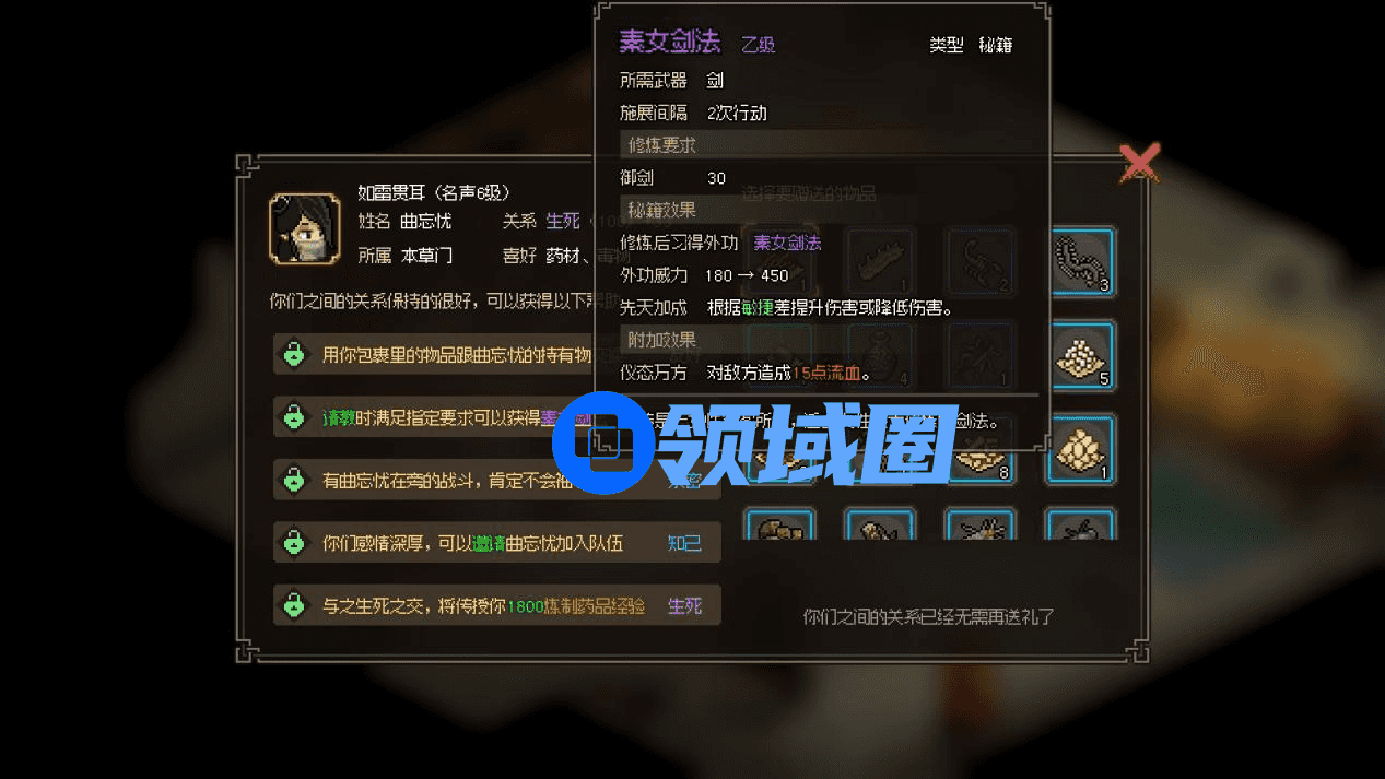 此外,人与人之间的关系也是我觉得颇有意思的玩法之一。在《大侠立志传》中,玩家可以通过事件选择或者送礼来和某个门派,某个阵营,甚至某个人交好,提升好感度。而与此同时,不同的好感度并不仅仅只是意味着简单的奖励,甚至有时候能起到推波助澜的强大作用。
