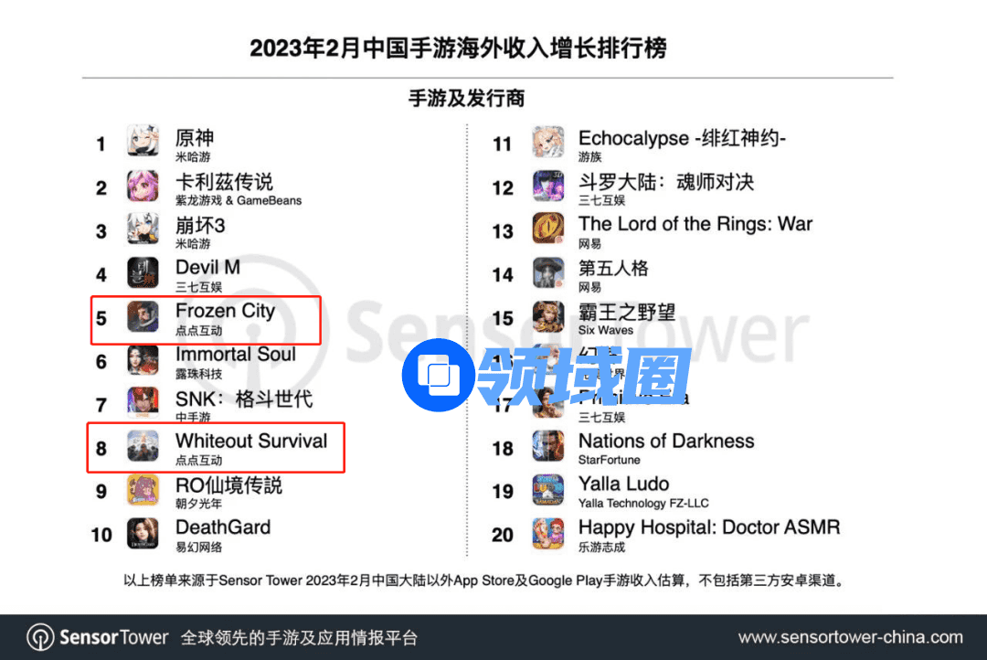 今年2月份,点点互动旗下一轻一重的两款末日新游《Frozen City》和《Whiteout Survival》双双跻身进入2月中国手游海外收入增长榜TOP10,成功实现了“一鱼两吃”。