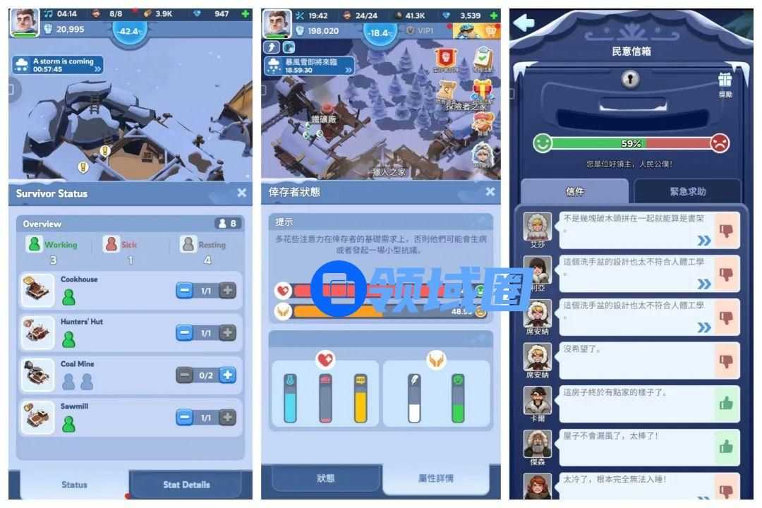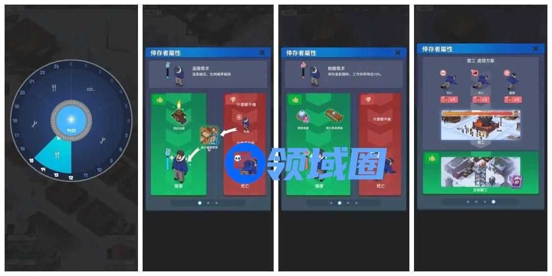 在资源循环的过程中,需要努力完成自救的“幸存者”也被刻画得十分真实生动。他们不是无限运转的机器,因此他们会在不同的时间阶段进行劳作、睡眠、吃饭,非劳作时间当然是没有资源产出的。而且在没有资源产出的时间里,我们依然需要耗费木材、食材等资源,去保证幸存者的健康和体力。当温度过低,他们会生病、甚至死亡;当饥饿指数过高,他们的劳作效率则会变低,当幸存者的不满情绪积累到一定程度,他们还会罢工。幸存者这个变量的出现,给玩家的资源调配带来了更多的挑战。