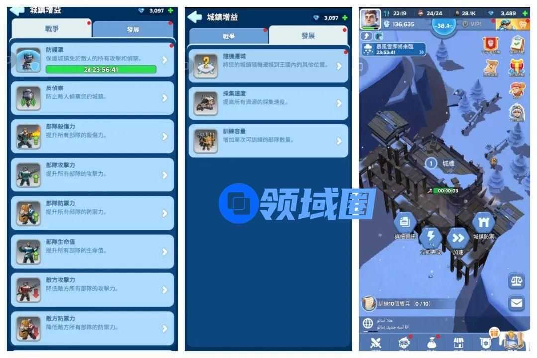 作为战力发展配套,城市内部增加了训兵营、城墙等建筑,城市外部还增加了防护罩、反侦察、部队杀伤力等城镇增益功能。