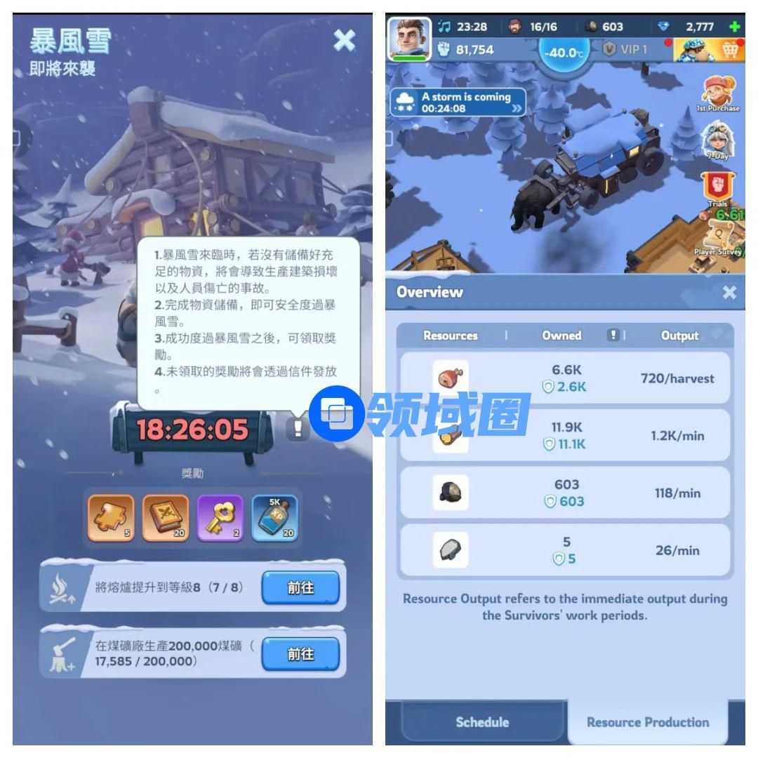游戏节奏方面,《Whiteout Survival》的游戏进程拥有更强的不确定性。玩家除了按照任务列表推进游戏进程之外,还需要注意不定期出现的暴风雪。玩家必须在暴风雪来临之前,完成所需的资源储备,才能避免建筑损坏或人员伤亡等事故的发生。