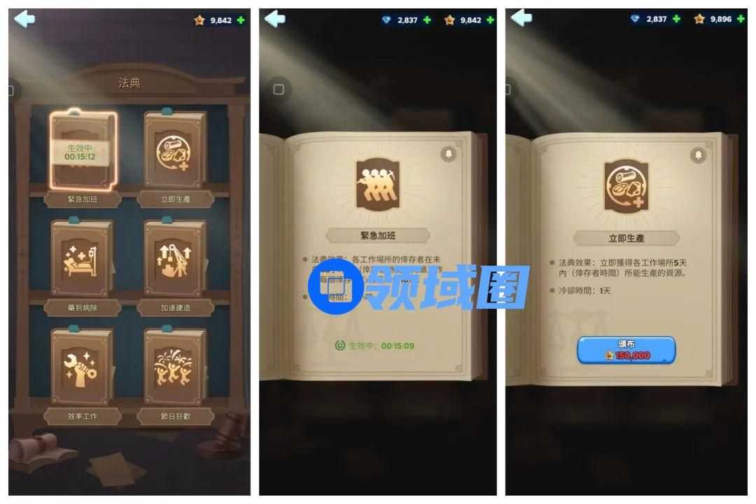 玩家从居民身上收集而来的“满意度”,可用于颁布“法典”,更加灵活地协调城镇经营效率。比如颁布“紧急加班”法典后,幸存者会持续工作48小时,同时心情值降低10点;“立即生产”法典生效后,玩家将立即获得幸存者在5天内可产出的资源。