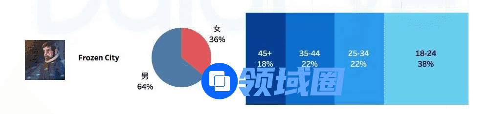 据《SLG品类增长白皮书(2022版)》,《Whiteout Survival》所在的SLG赛道中,男性用户占比高达88%,女性占比仅有12%,且玩家年龄段以26-30岁居多。而据DataEye统计的数据,定位是模拟经营的《Frozen City》,女性用户占比更高,达到了36%,年龄层主要集中在18-24岁之间。