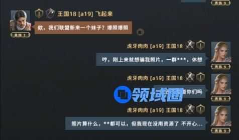 热情似火的汉子们为了让“妹子”爆照,这点资源又算什么呢?玩家A挨个夸夸彩虹屁,新盟友们就纷纷将资源主动送给了“妹子”!