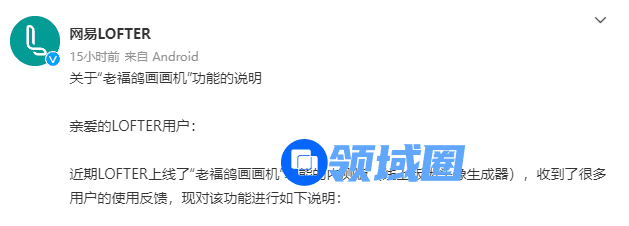 6日晚上,网易LOFTER官方微博发布关于“老福鸽画画机”功能的说明,对争议事件进行了一个简单的解释,其说明内容如下: