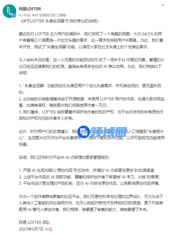 今天(7日),网易LOFTER官方微博再做回应,发布了一条《关于LOFTER“头像生成器”引发的争议的说明》。表示 “头像生成器” 功能只是为了满足更多用户的个性化头像需求,并没有任何盈利目的,并放话,如果平台确有侵权,他们将为每张图片的创作者赔偿一万元。