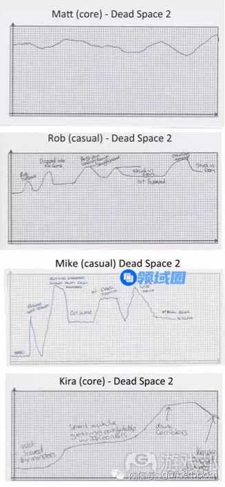 玩家画下的《死亡空间2》体验表,比其他游戏更富动态,甚至一向淡定的Matt画下的线也呈波浪状,说明他在游戏中也很投入。另外,玩家很容易就回想起自己受到惊吓的各个事件。