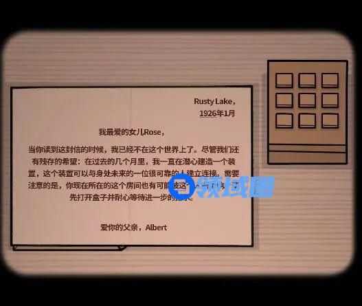 过去的故事则发生于一个贴满复古花纹墙纸的锈湖味房间,玩家可左右切换在房间内点击探索。桌面上的信,指向方块内的故事发生于1926年秋Albert去世后,他似乎在逝世前夕就有预料,为女儿Rose留下嘱咐——