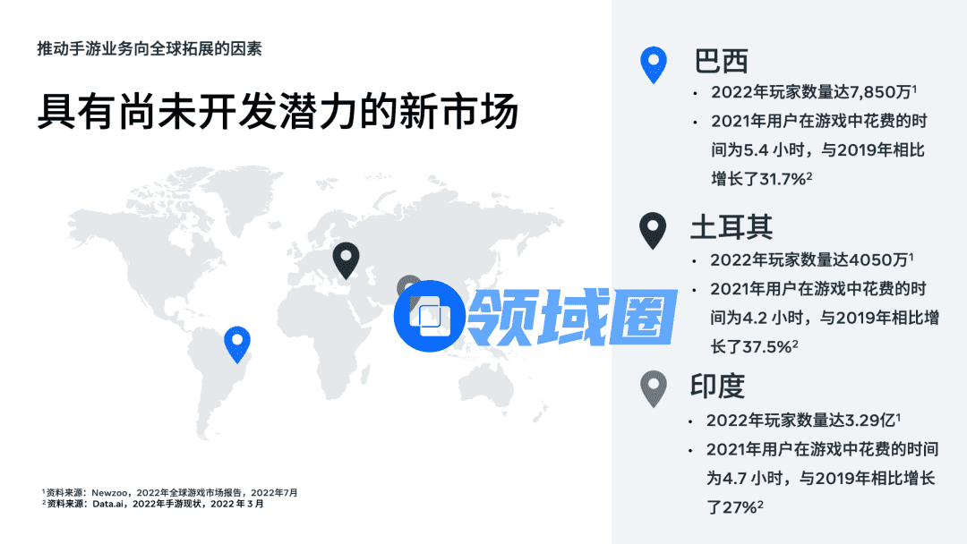 事实上,很多游戏发行商已把拓展全球业务视作当务之急。Meta Audience Network认为,若想进军新市场,除了欧美日韩等成熟市场外,不妨考虑以下三个高潜力市场: