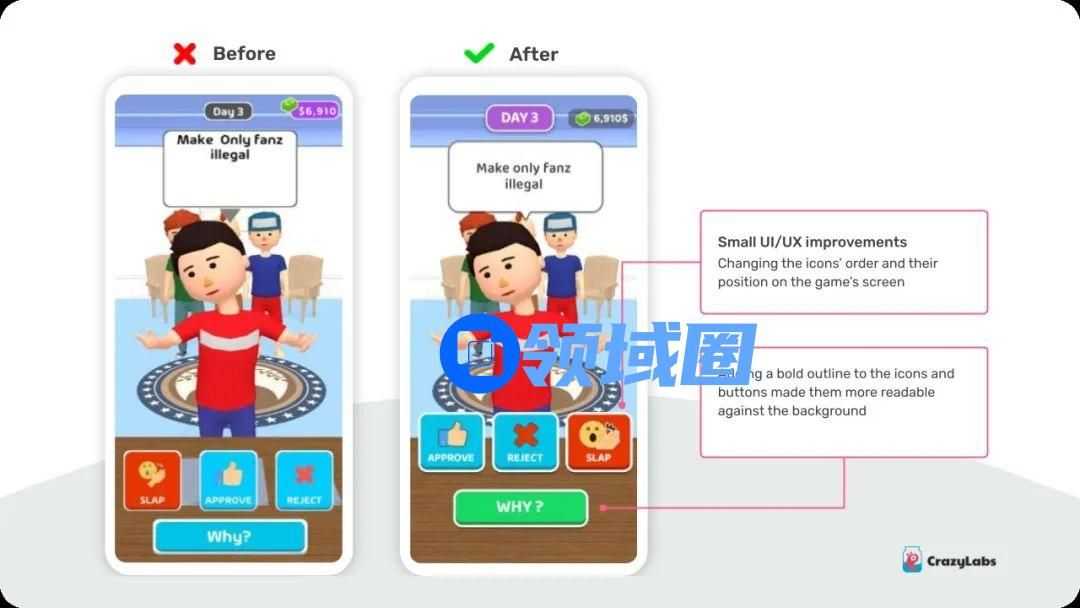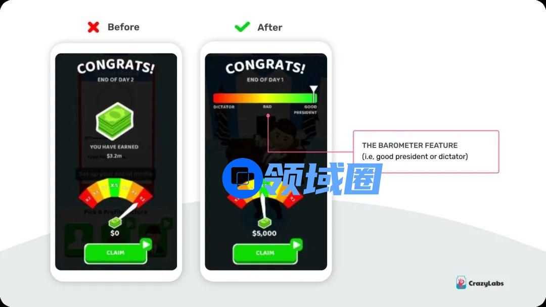 我们面临的最大挑战是D1的用户留存不够。想要提升留存,仅仅在游戏里添加内容是不够的。一开始,这款游戏的D1是21%, Usage 为30min。与CrazyLabs团队密切调优后,D1提升到 42%,Usage 也达到45min。