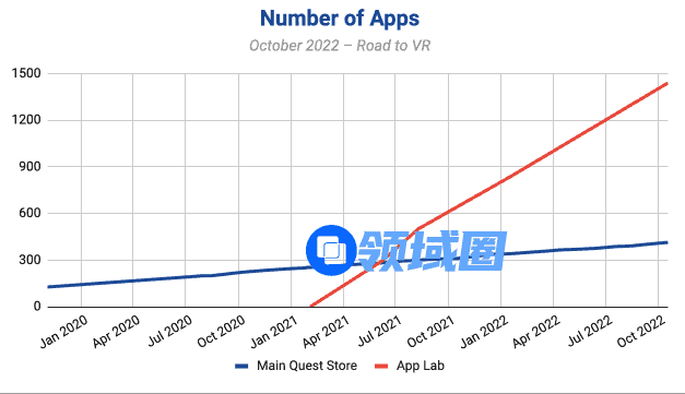 据外媒Road to VR报道,自从Meta于2021年初推出App Lab以来,该平台上的游戏和非游戏类应用总数量已经达到了1457款,超过Quest商店内应用数量的三倍。经过近三年半的运营,Quest商店内的应用数量为 414 款。
