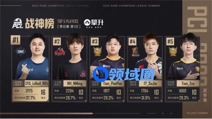PCL夏季赛首日,战况便极为胶着,NH战队首发开局,先灭HQ、Tian,后又大战PeRo独狼,成功吃下首鸡。随后各大战队纷纷发力,轮流吃鸡。最终,NH队内选手NH_MMing以28.7%得分贡献率帮助战队以26的积分拿下首日排名榜第1;Tian战队的PaoPao和Zyy也分别以28.3%和28.3%的好成绩,将战队推上了首日榜第2;SYXL战队以77的总积分屈居第3名,但LuRenA_9614却凭借着37.7%的超高得分贡献率位居战神榜之首,并在首日中贡献了高达16个淘汰数!