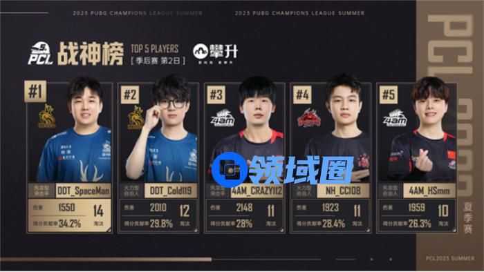 PCL2023第二日,NH战队继续保持首日的状态,以两鸡的优势豪取144总积分,继续高居榜首,队内选手NH_CC108以28.4%的得分贡献率,和11个淘汰数排名战神榜第4;DDT战队在本日对战中,以94排行第7,但其选手DDT_SpaceMan和DDT_Codd119却以34.2%和29.8%的高额得分率拿下了战神榜的前两名。通过和队友的良好配合,4AM战队的4AM_CRAZY112和4AM_HSmm以28%和26.3%的得分贡献率位居战神榜第3和第5,并顺利将4AM积分排名往上推了两个位置。
