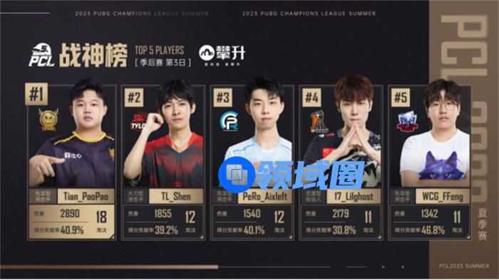 比赛最后一日,虽然定局渐显,但前5的积分排名依然激烈,不到最后一线,输赢难料。好在17Gamin战队虽然未吃一鸡,但整体发挥相对平稳,并和季军拉开了27的分差;Tian战队在最后一刻终于凭借着一鸡之力,并以5分的微弱优势,从第4名冲到第2,PeRo战队排名第3,和第4名的SYXL也仅仅2分之差,但PeRo的Aixleft选手则是以153的恐怖淘汰和26966总伤害,成为了本次PCL2023夏季赛的联赛战神!