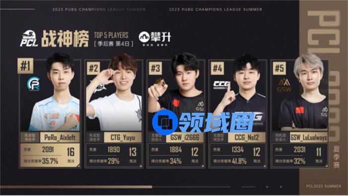 极为关键的第4日中,17Gaming终于后发制人成功,以两吃鸡的绝对优势,反超NH,跃居榜首。PeRo战队也不甘落后,PeRo_Aixleft以16个淘汰和35.7%的贡献率拿下战神榜榜首,并帮助自家战队成功挤进了排名的三强之列。另一边,GSW战队排名虽然不高,但其成员们的斗志却一如既往!特别是GSW_ii2666和GSW_LuLualways分别以34%和32%的贡献率斩获战神榜第3和第5。
