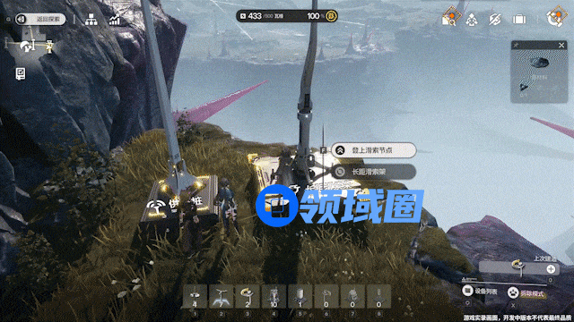 随后就是重磅了,终末地的地图设计里存在大量无法通过步行直接到达的区域,且区域与区域之间存在距离、高低差,这个时候就需要使用运力与临时的交通设备,这就有了【长距滑索塔】,画面中玩家建设好【长距滑索塔】后直接画像到达了矿区,并顺手建了一个【矿机】。