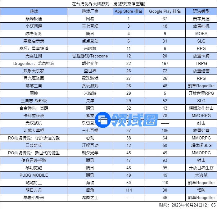 在本期中国台湾地区的大陆出海秀中,腾讯共5名选手入榜,此外,网易旗下赛车题材的《巅峰极速》和米哈游的冒险RPG《原神》分别是App Store和Google Play排名最靠前的游戏。