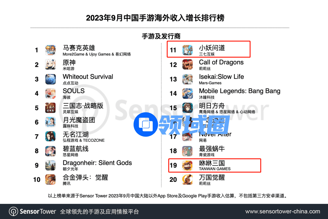 比如仅在Sensor Tower发布的9月中国手游海外收入增长排行榜上面,就有两个我们熟悉的爆款小游戏,它们就是来自三七互娱的《小妖问道》(寻道大千)和贪玩游戏的《咻咻三国》(三国吧兄弟)。