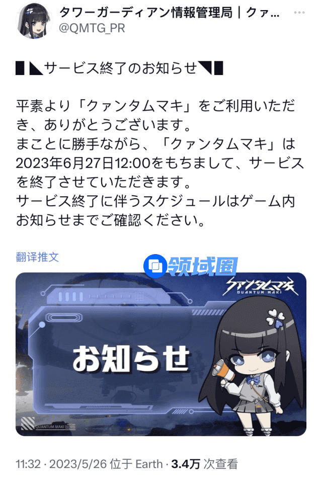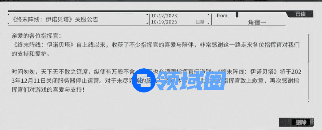 近日,由成都聚获网络研发的二次元机甲弹幕射击游戏《终末阵线:伊诺贝塔》(以下简称伊诺贝塔)发布了停服公告,游戏将于2023年12月11日正式关闭服务器运营,这也意味着这款在去年5月份才上线的二次元新作仅运营不到一年半的时间就不得不宣布停服,是又一款在今年草草退出历史舞台的二次元“败北者”。