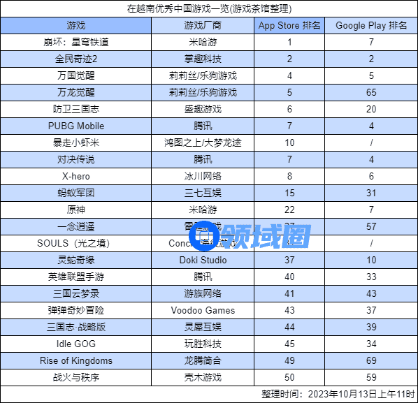 整理范围:越南App Store畅销榜前50名上榜国产游戏如下: