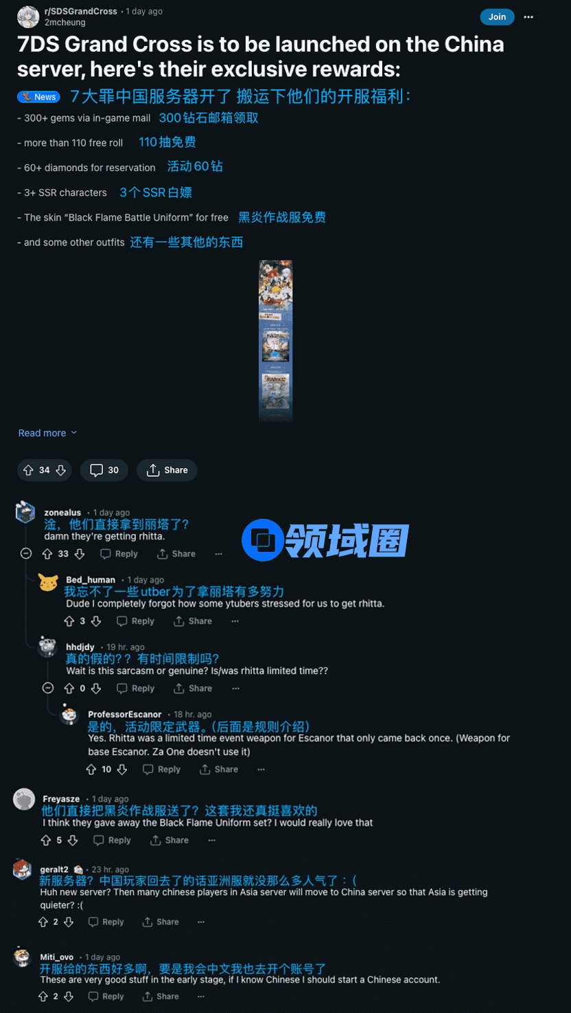 在知名海外玩家论坛Reddit上,有《七人传奇》的外服玩家把国服的开服福利列表整理并搬运了过去,并点出这些都是国服独享内容,而下面的回复清一色透露着隔着网线都能闻到的“酸味”。
