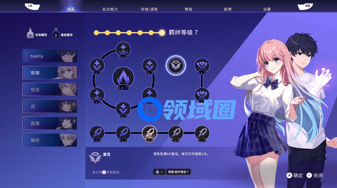 每个角色都有一套技能树,解锁后续的技能就需要提升羁绊等级。帮助不同的女主找物品也能提升一部分的属性。虽然这套系统为角色提升羁绊提供了正向循环,但也不可避免的出现了玩家因为角色的喜好而耽误了自身的性能。