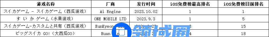 10月7日数据,日本iOS免费榜TOP20一连涌现出了4款题材和玩法类似的产品,其中来自Ai Engine的《スイカゲーム - スイカゲーム》和ONE MOBILE LTD的《すいかゲーム》两款游戏最高都曾登上iOS免费榜TOP1,且目前《スイカゲーム - スイカゲーム》依然持续稳坐榜首。