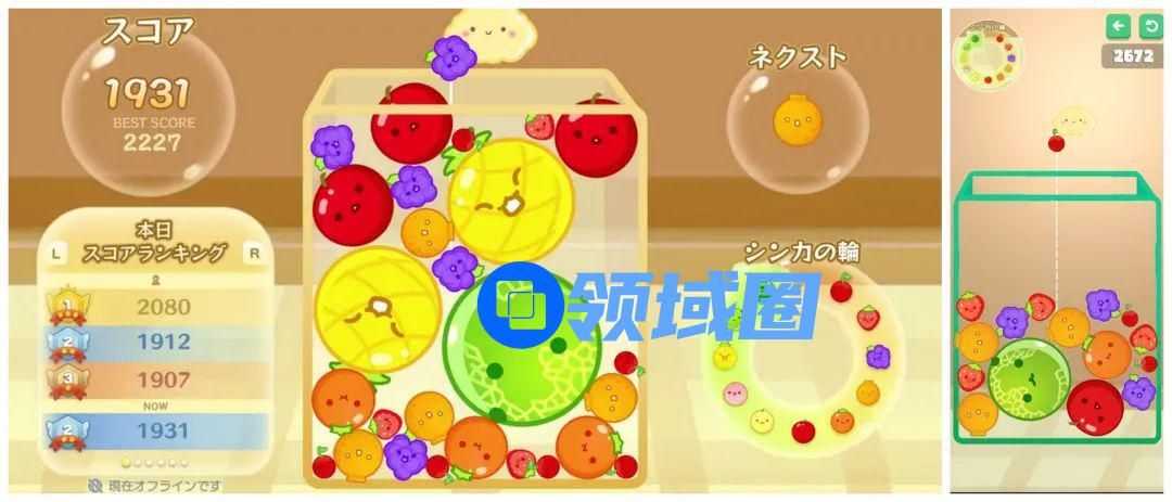 相较于简洁的《合成大西瓜》,《Suika Game》的界面内容更加丰富,在主界面中,玩家可以看到自己的当前得分、最佳分数,今日分数排行榜、下一个元素、元素合成链条和合成主界面框。