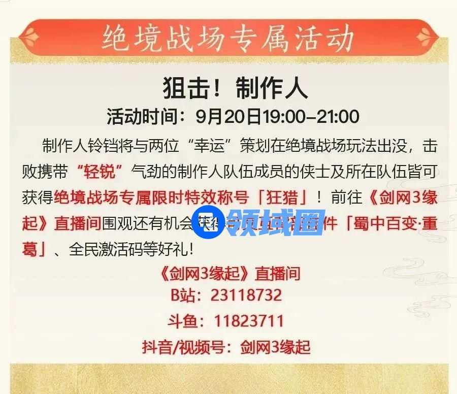 龙门如此热闹,怎么能少的了制作人团队的身影?9月20日19:00-21:00制作人铃铛与两位“幸运”策划将在绝境战场出没,他们摩拳擦掌,准备在大漠风沙中一展身手!侠士们可组队前去击败携带“轻锐”气劲的制作人队伍,击败者所在队伍皆可获得绝境战场专属限时特效称号「狂猎」!活动期间制作人团队将在多平台进行直播,侠士们也可去下图平台直播间围观,有机会获得可交互背部挂件「蜀中百变·重葛」、全民激活码等好礼,期待看到侠士们的精彩弹幕哦!