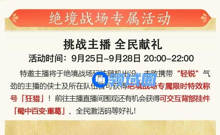 制作人团队已经出击龙门绝境一探楼兰的宝藏,主播团队也将紧随其后!9月25日-9月28日每晚20:00-22:00,特邀主播将于绝境战场出没,连续三天同一时段等待侠士们前去挑战!侠士们击败携带“轻锐”气劲的主播,击败主播者以及其所在队伍皆可获得绝境战场专属限时特效称号「狂猎」!前往主播直播间围观还有机会获得可交互背部挂件「蜀中百变·重葛」、全民激活码等好礼!侠士快叫上亲友一起去大漠找寻主播们的身影吧!