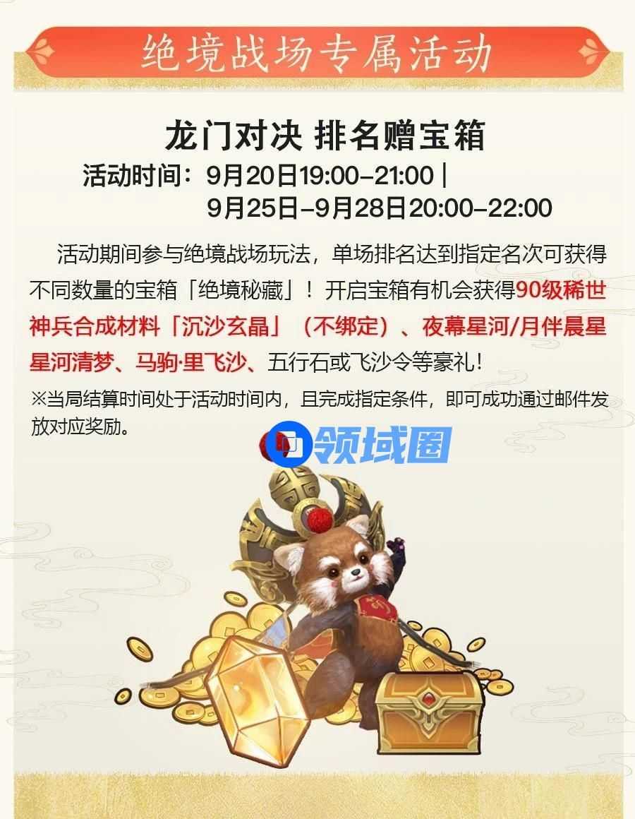 狙击!制作人与挑战主播活动期间全民参与吃鸡玩法根据排名结算皆有好礼可得。侠士在活动期间参与龙门绝境玩法,单场排名达到指定名次可获得不同数量的宝箱「绝境密藏」!开启宝箱有机会获得90级稀世神兵合成材料「沉沙玄晶」(不绑定)、夜幕星河/月伴晨星、星河清梦、马驹·里飞沙、五行石或飞沙令等豪礼!多重好礼加持,绝境吃鸡惊喜满满!