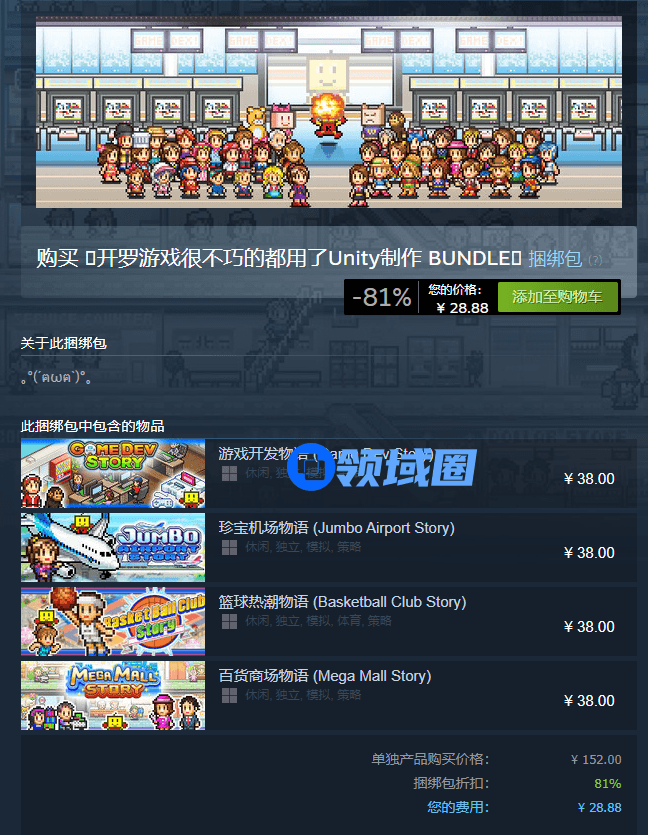 日本知名经营模拟类厂商开罗游戏近日在Steam上推出一个名为“(哭泣)开罗游戏很不巧都用了Unity制作(哭泣)”的促销捆绑包。促销包含《游戏开发物语》《篮球热潮物语》《百货商场物语》和《珍宝机场物语》等四款游戏,折扣高达81% off,合计售价仅28.88元!