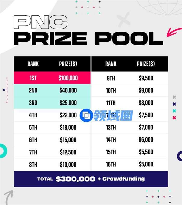 本次PNC 2023的奖金池将采用30万美金+众筹的模式。在30万美金中,冠军10万美金,亚军4万美金,季军2.5万美金。第4-16名根据名次分别获得不同的奖金。而随着后续众筹赛事专属道具的回归,PNC 2023 冠军竞猜活动的总奖金也会不断增加。最后的总奖金会根据比赛的最终排名分配给所有参赛者。