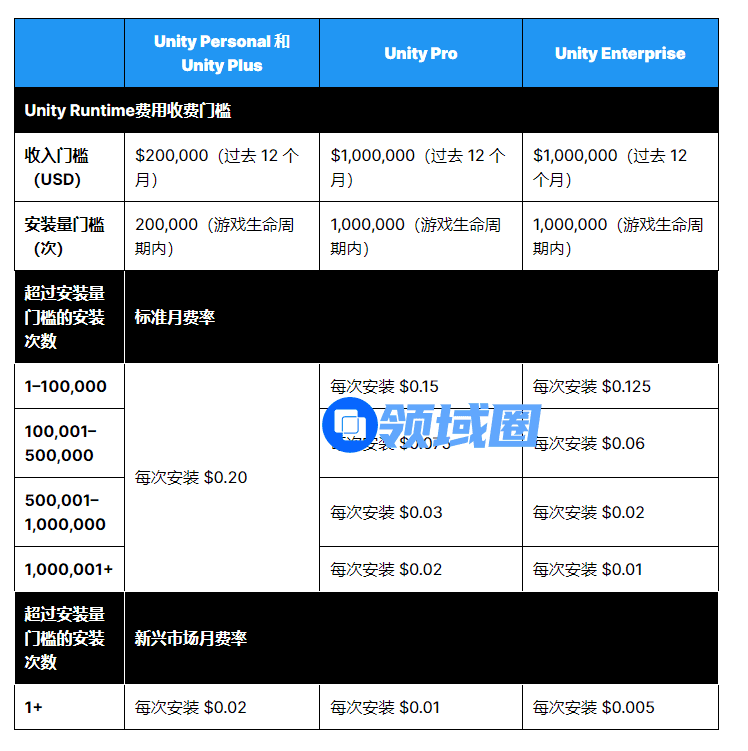 至于这项费用后续如何收费,Unity给出了一份十分详尽的“解决方案”。首先,只有达到官方预设门槛的游戏才会被收取费用。Unity Personal 和 Unity Plus 用户的标准是,“过去 12 个月的收入达到或超过 20 万美元,且达到了20 万次的游戏生命周期内的安装量。”而Unity Pro 和 Unity Enterprise的标准则是:“过去 12 个月的收入达到或超过100 万美元,且达到了 100 万次的游戏生命周期内的安装量。”