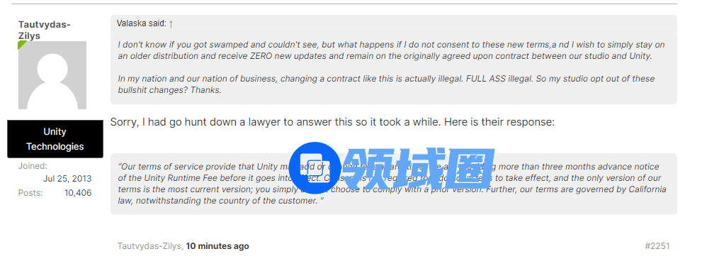 此举一出,引发全球从业者的广泛讨论,光Unity的官方博客,该帖的回复就超过了2200个,其中有一位用户甚至质问官方,在他们国家,擅自更改用户协议是违法的。然而官方回复却表示:“我们的服务条款规定,Unity可在任何时候增加或改变收费标准,我们在正式施行前会提前三个月通知到各位用户,额外的费用收取并不需要征得同意。”