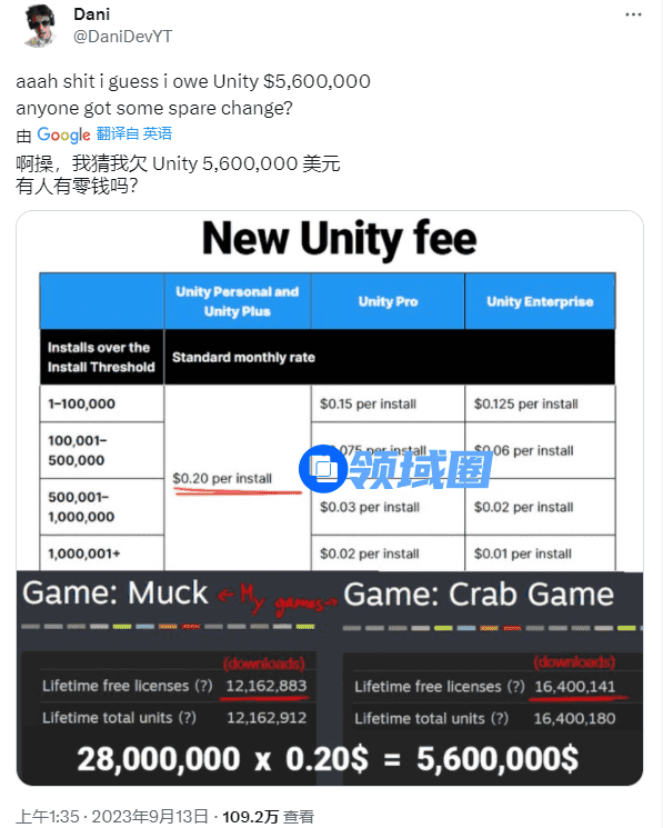 一位国内的Unity开发者告诉茶馆,今天早上醒来看到这个新闻的时候,感觉天都快塌下来了,都准备要换引擎了,这时候才看到还有20万美元收入的附加条件,才想到自己赚的钱还不到这的零头,顿时感谢Unity的“不杀之恩”。