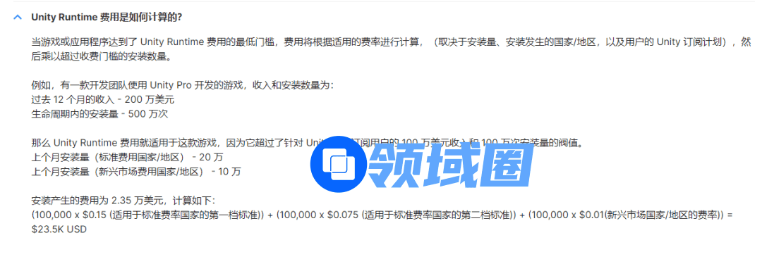 不过从官方给出的案例来看,这个地区并不是指开发地区,而是产品的安装地区。一旦在海外市场进行了大规模的下载安装,那费用就需要按照上表对号入座。官方给出了明确的计算方式,茶馆就不再赘述,具体可看下图。