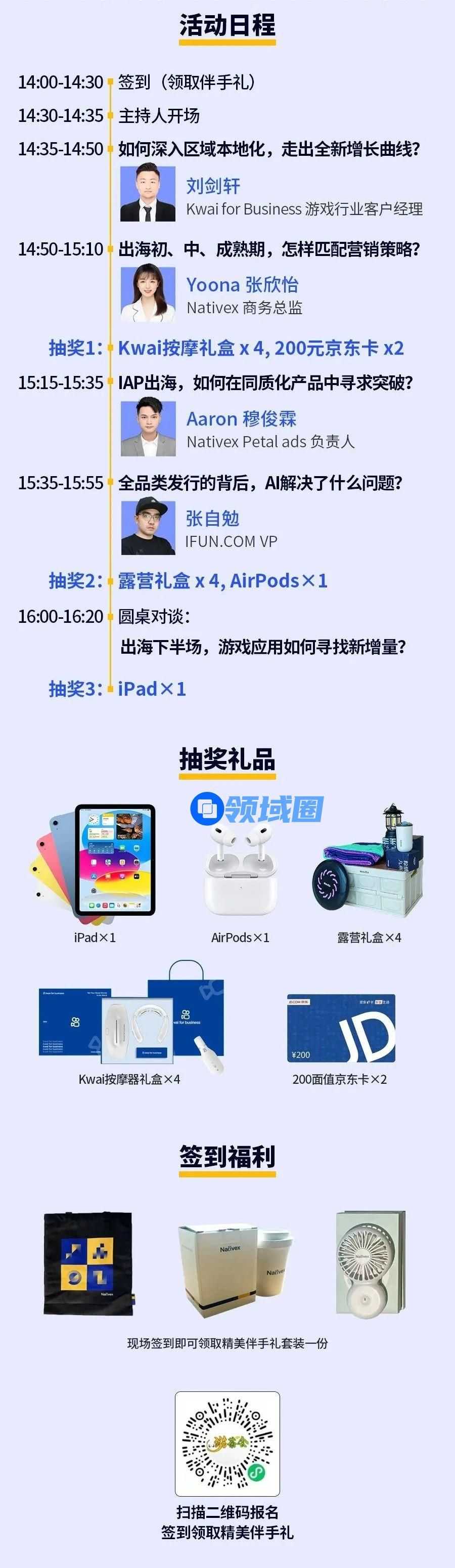 除了满满干货,现场还为大家准备了精美伴手礼和iPad、AirPods、露营礼盒、Kwai按摩器礼盒、200面值京东卡等众多豪礼,干货+大奖,机不可失,大家扫描下方二维码赶快来报名吧!以下是本次沙龙的具体日程: