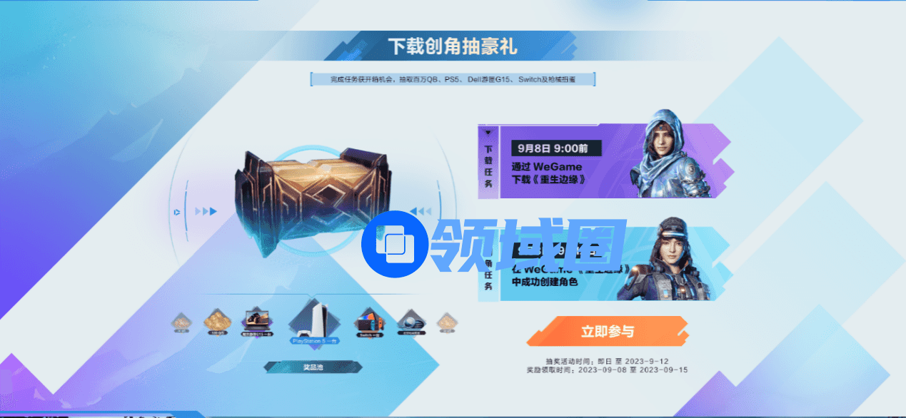 在活动期间,只要在Wegame《重生边缘》中成功创建角色,即可获得开箱机会且中奖率100%。箱内豪礼不仅有百万QB、边界枪械扭蛋等游戏道具,玩家还有机会开出PS5、Del游G15、Switch等超级实物大奖,心动不如行动,感兴趣的玩家,快来试试你的开服好运吧!