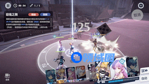 其次是游戏特色的“动态指令”机制,正式入战后双方角色会根据预设好的方向自动接敌,而过程中玩家除了可以使用角色大招,还有消耗COST出牌的主动技能。每个角色仅能带一个主动技进场,根据功能划分有直伤,控制、打断等一系列Debuff,所以规划好每个角色的出牌时机就成了决定胜负的关键。